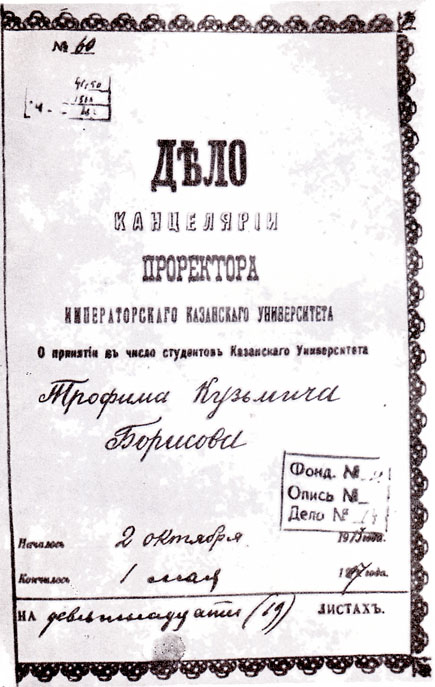 1912–1913-тӥ аръёсы дышетсконзэ азьланьтӥз Санкт-Петербургысь университетлэн историко-филологической факультетаз. Отчы пырон понна, ас кожаз гимназилэсь курссэ дышетӥз но экстернэн экзамен сётӥз. Тодмо этнографлэн Д. К. Зеленинлэн (вордӥськемын Ижевской волостьысь Люк гуртын) кивалтэмез улсын научной ужен выриз, статьяос гожъяз, «Живая старина» журналын печатласькиз.