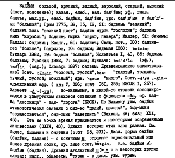 В. И. Алатыревлэн «Этимологический словарь удмуртского языка» (1988, с. 139) ужысьтыз люкетэныз тодматске. «Бадӟым» кыллэн кылдэмез сярысь вакчияк вераны дасяське.