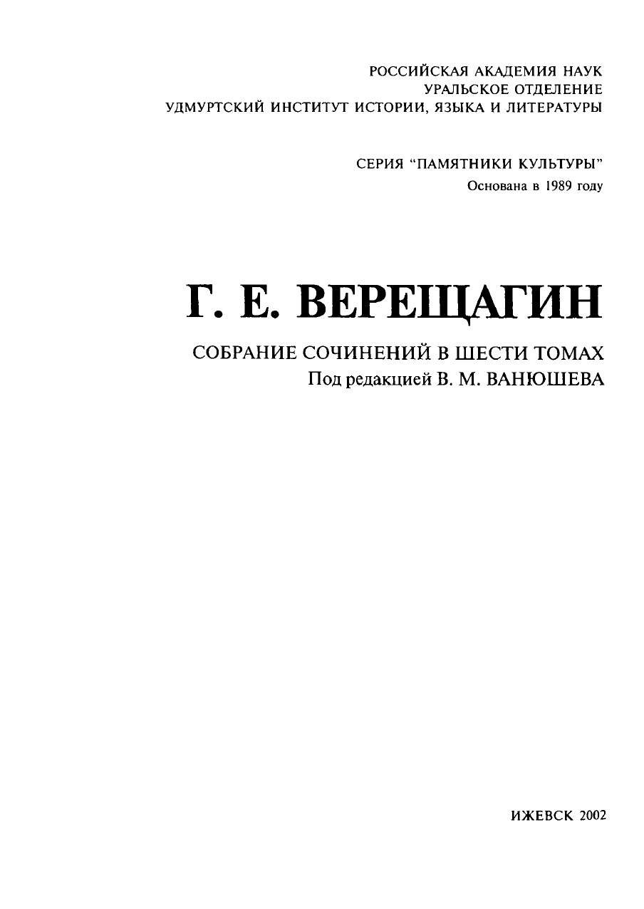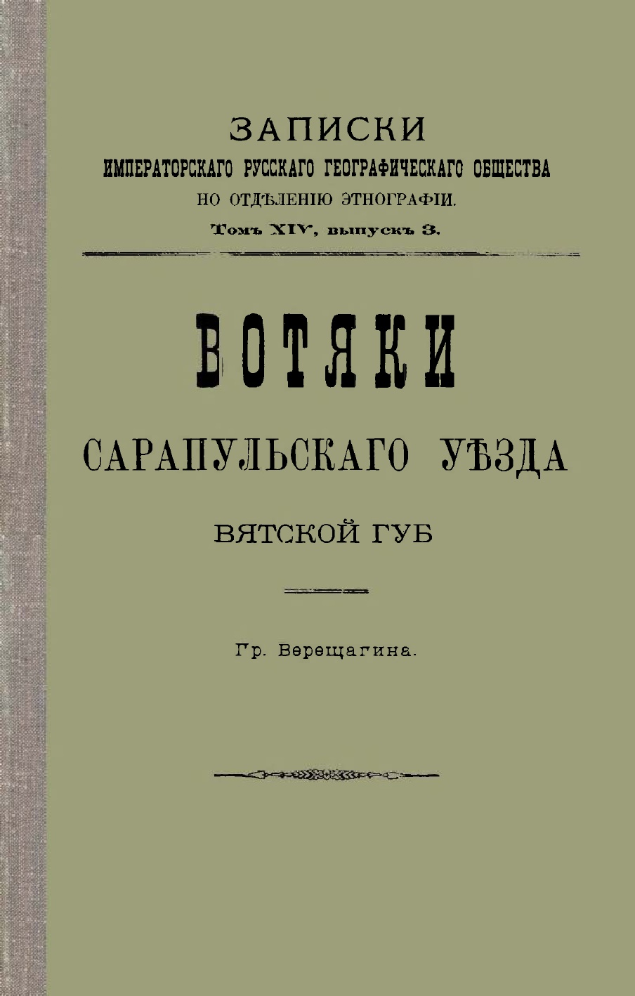 Верещагин Г. Е. Вотяки Сарапульского уезда Вятской губ.— С.-Петербург: Тип. И. Н. Скороходова, 1889.— 197 с.
