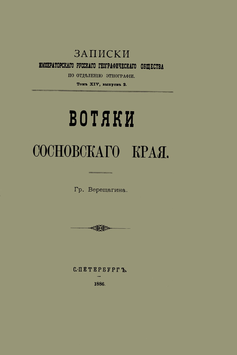 Верещагин Г. Е. Вотяки Сосновского края / Предисл. П. А. Соколовского.— С.-Петербург: Тип. М-ва внутр. дел, 1886.— 218 с.
