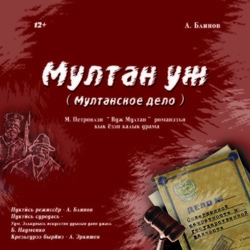 Афиша спектакля А. Блинова «Мултан уж» («Мултанское дело») по роману М. Петрова «Вуж Мултан» («Старый Мултан»).