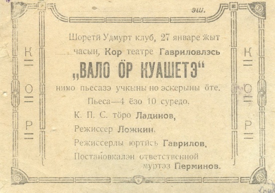 1931-тӥ арын 7-тӥ тулыспалэ «Вало ӧр куашетэ» спектакльлэн премьераез ортчиз. Игнатий Гавриловлэн та пьесаез Удмурт драмтеатрлэн историезлы кутскон сётӥз.