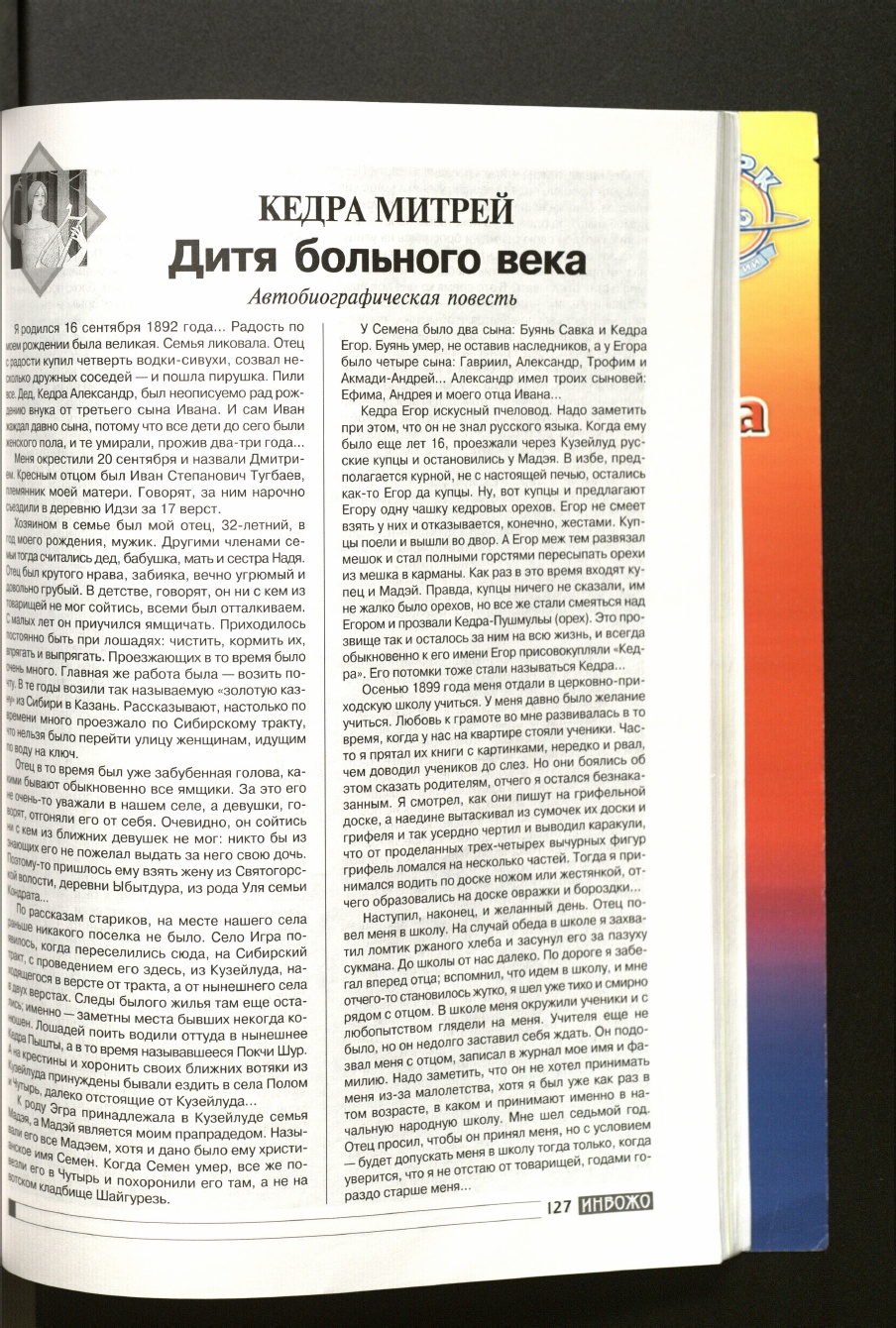 1910–1911-тӥ аръёсы Кедра Митрей ӟуч кылын «Дитя больного века» асулонсюрес повестьсэ гожтэ. Повестьын валтӥсь инты басьтэ егит муртлэн аслэсьтыз улон сюрессэ эскеремез, аслаз вамышъёсызлы валэктон утчамез но дунъет сётэмез. Герой вакчияк маде школаын но Зураысь училищеын дышетскемез сярысь. Тросгес саклык висъя Кузонысь семинариын дышетскемзэ возьматонлы. Асулонсюрессэ вераназ со пыртэ ас гуртэзлэсь но семьяезлэсь историзэ, чебересь инкуазь суредъёсты но туж трос пӧртэм адямиослэсь портретъёссэс.